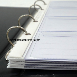 Copertine in plastica con incisioni prestampate, meccanismo a quattro anelli diametro 20 mm, capacità di 20 inserti uni circa o 6 inserti uni monete.