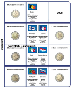 Fogli per raccogliere e collezionare le monete da 2 EURO commemorative di tutti i Paesi Europei aderenti alla moneta unica, pagine a taschine complete di scheda tecnica in cartoncino con immagine di ogni moneta emessa.