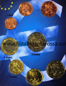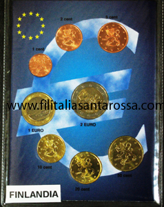 La serie completa di monete in Euro della Finlandia composta da otto monete: 2 euro, 1 euro, 50 20 10 5 2 1 centesimi